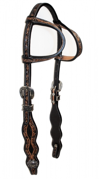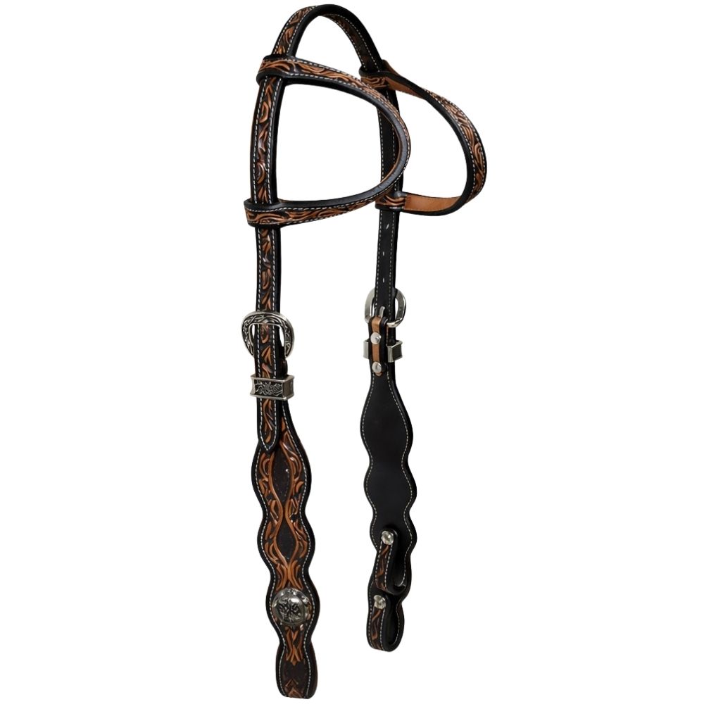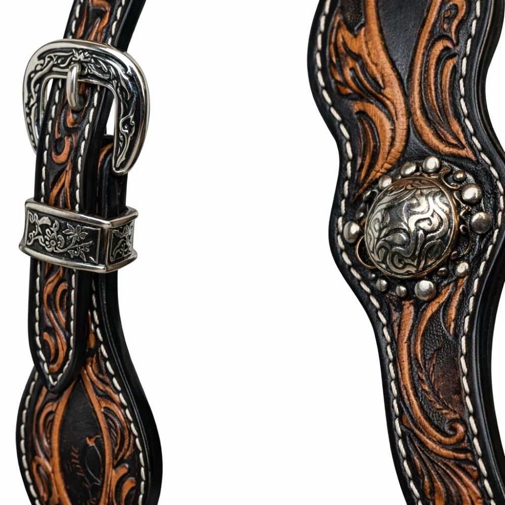 Diese exklusive Westerntrense von SN Tack kombiniert elegantes Design mit hoher Funktionalität und ist ideal für den Einsatz im Showring. Das edle schwarze Leder wird durch ein detailreiches rostfarbenes Blumenmuster verziert und macht die Showtrense zu einem echten Blickfang.